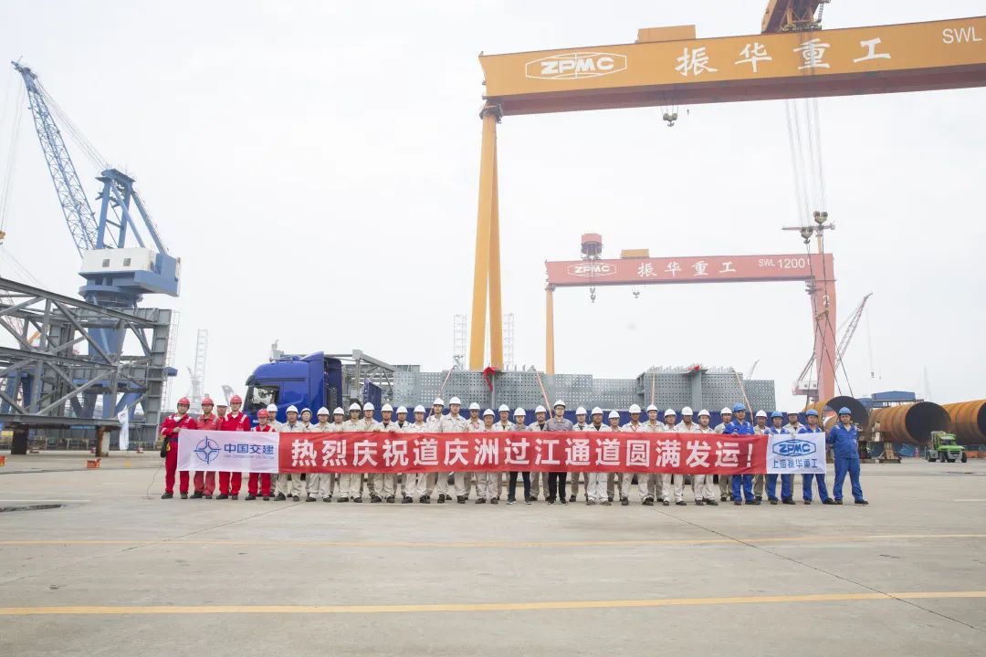 6月14日,南通振华重装承建的道庆洲过江通道主桥钢桁梁合龙段在鞭炮齐鸣声中被发运至福州。16月15日,福建省福州市乌龙江上,伴随着阵阵铁锤敲打声,一颗颗冲钉被敲入上弦杆螺栓孔中,道庆洲过江通道项目主桥成功合龙。