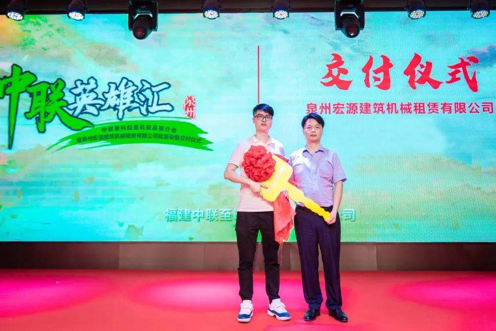 产品交付仪式,由福建中联至诚工程机械有限公司董事长黄朝顺先生将象征着打开财富大门的金钥匙交给泉州宏源建筑机械租赁有限公司总经理许庆祝先生。