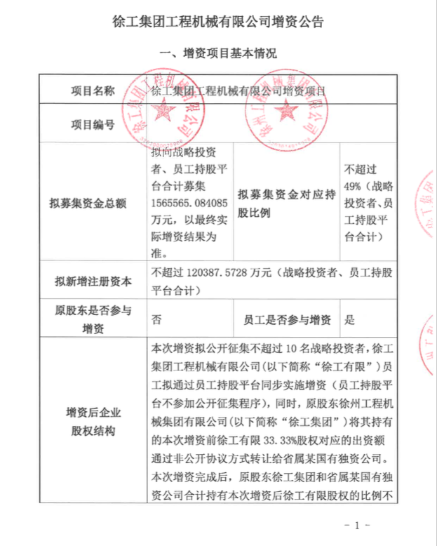 徐工集团工程机械有限公司(简称公司)按照2019年7月25日徐州市国资委审批通过的《徐工集团工程机械有限公司混合所有制改革试点实施方案》,于2020年6月24日将公司混合所有制改革涉及的增资项目在江苏省产权交易所公开挂牌。具体内容详见江苏产权市场网上披露的《徐工集团工程机械有限公司增资公告》。 公告称,公司将通过存量转让和增资扩股方式引入战略投资者。本次增资完成后,公司股东徐州工程机械集团有限公司(简称徐工集团)和省属某国有独资公司合计持有本次增资后公司股权的比例不低于51%,战略投资者和员工持股平台合计持有本次增资后公司股权的比例不超过49%(其中员工持股平台持股约2%),最终以实际增资结果为准。