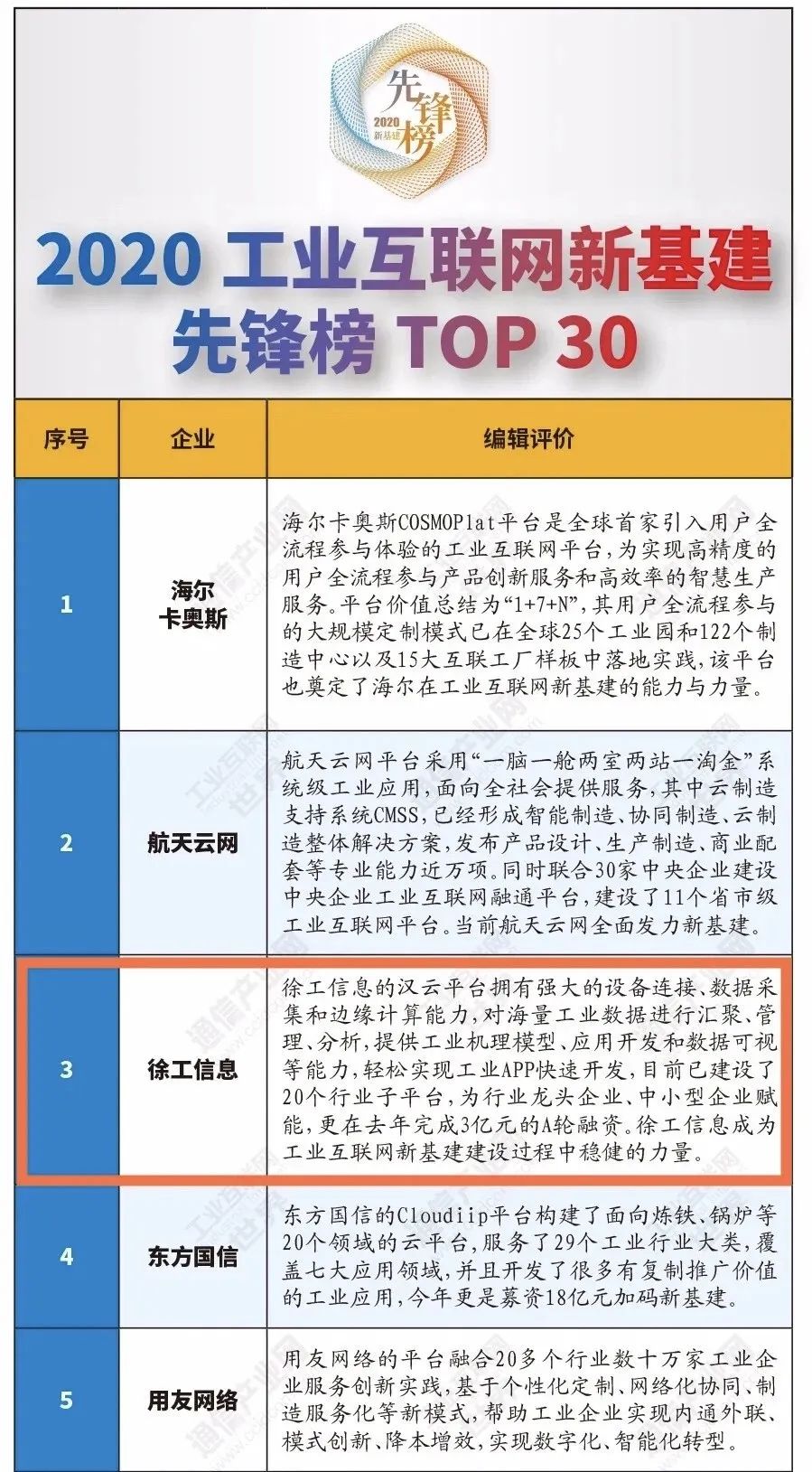 6月29日,工信部《通信产业报》发布《2020工业互联网新基建先锋榜TOP30》,徐工“汉云”工业互联网平台跻身前三甲。