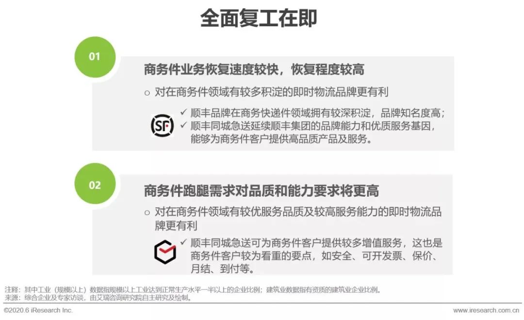 疫情后时代,企业大面积复工复产,社会经济秩序逐渐恢复稳定,因此相较其他受影响品类,即时物流的商务件恢复速度较快,恢复程度较高。同时,由于疫情对企业及个人的抗风险压力阀值都产生了消极影响,因此,疫情后时代,即时物流商务件将更加关注服务品质和服务能力。