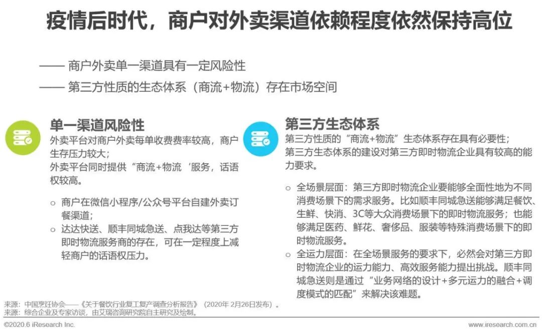 2020年疫情对中国餐饮市场的影响是巨大的,而因此,大部分线下餐饮商户在本次疫情期间,明显提升了其对外卖渠道的依赖度。但如采用单一的外卖平台,则其渠道风险性较大,如平台佣金率、服务费等成本较高,因此也有部分商户逐渐开始自建外卖订餐渠道。由此可看出,在现有头部外卖平台外,第三方生态体系(商流+物流)存在的合理性和必要性明显。