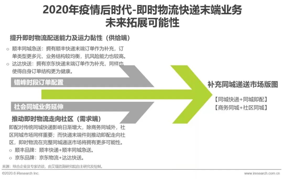 疫情前,即时物流的快递末端业务已存在,从供给端来看,即时物流餐饮订单比重较高,峰谷时间段明显,因此错峰订单的配置极为重要,快递单作为补充将极大提升配送能力及运力黏性;疫情后时代,即时物流对传统同城快递影响将更加显著,但除商务同城递送外,社区同城递送市场同样重要,通过快递末端业务,则能够帮助推动即时物流走向社区。即时物流在完整同城递送市场将拥有更多可能性。
