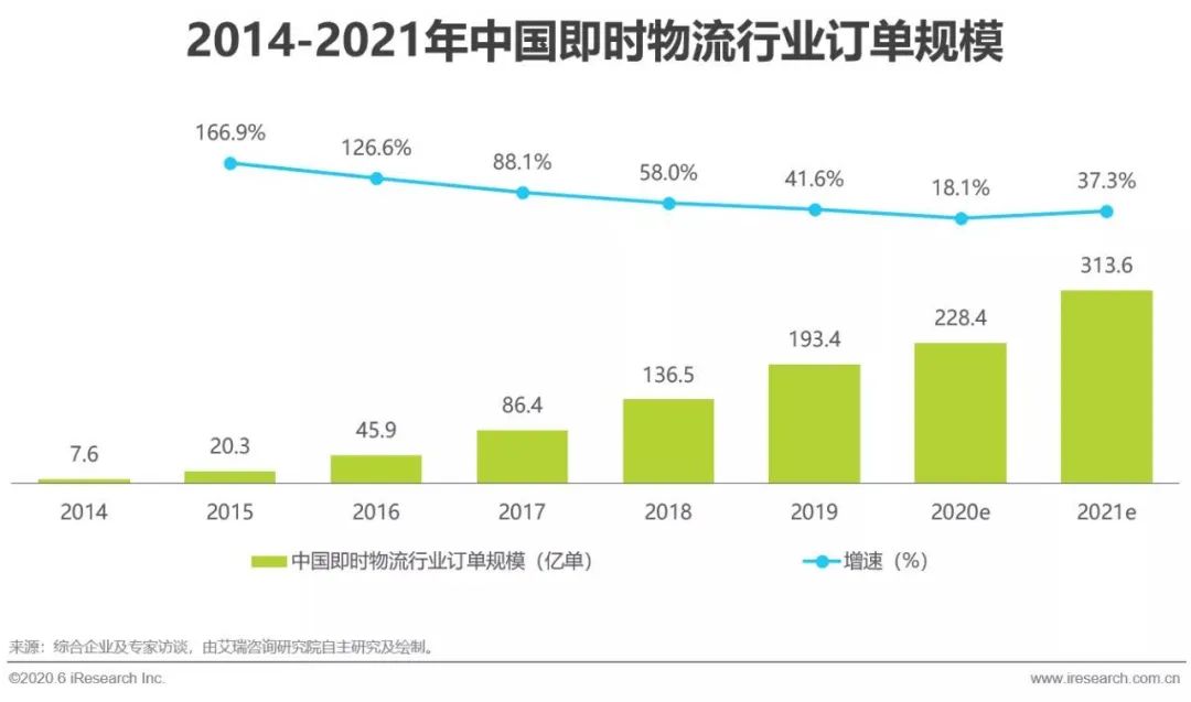 从市场订单规模来看,2020年新冠肺炎疫情对即时物流行业产生了显著影响,2020年的预计增速相较2019年有明显跌幅,但目前来看,即时物流行业的整体发展前景向好,预计2021年将有明显恢复。从近两年的整体即时物流行业来看,入局者不断增加,如顺丰集团下顺丰同城急送的即时物流品牌独立;滴滴上线“滴滴跑腿”,切入即时物流市场等。市场活跃度明显提升,竞争显著,有益于整体即时物流行业的健康发展。