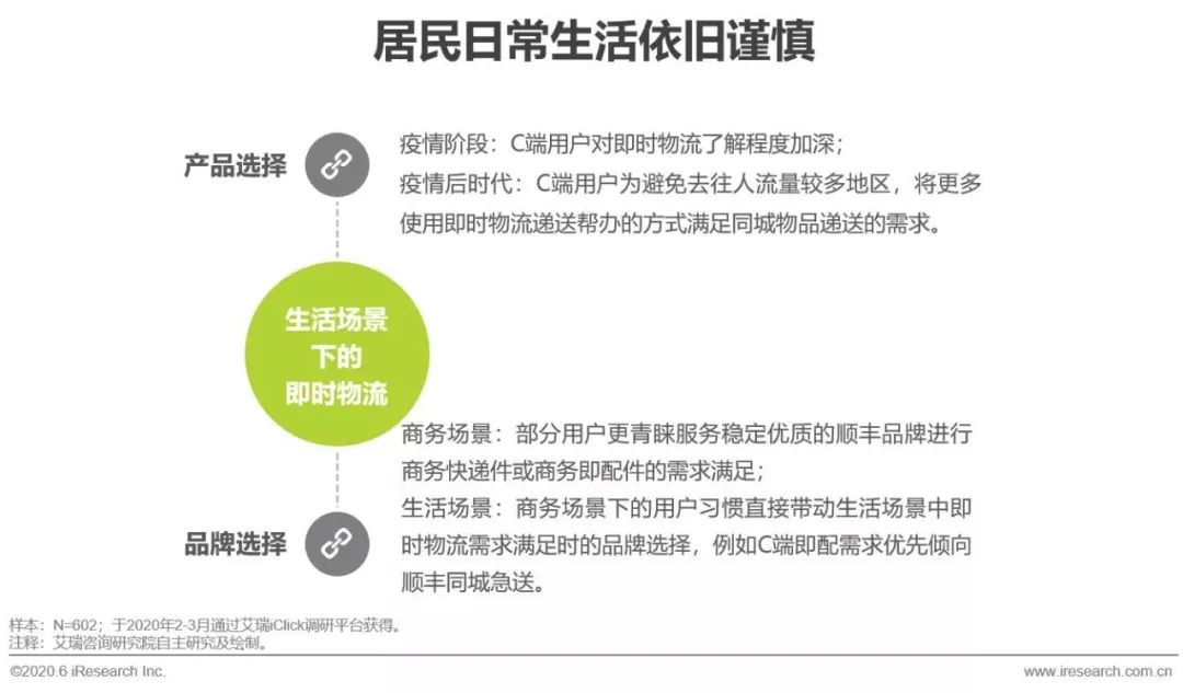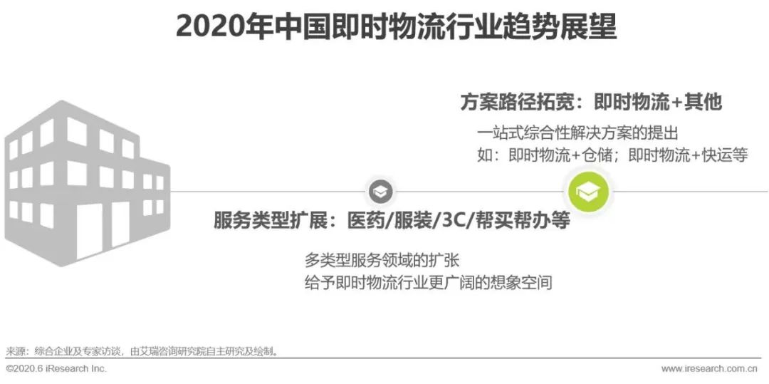 2020年疫情对即时物流需求类型和产品服务类型都有较大影响,从客户角度来看,不仅仅是“跑腿”类需求的多样性增加,消费者对其他消费行业的即时到家服务也有较大兴趣和较高期待,例如“医药到家”、“服装到家”等,未来即时物流的可能性将不会局限于餐饮、生鲜等已发展多年的消费领域,其他行业也将会产生更多可行的即时到家方案。另外,除消费行业即时物流可能性的拓宽外,“即时物流+其他物流服务”的综合性解决方案未来也将更常见,例如“即时物流+仓储”、“即时物流+快运”,目前已有如“‘中铁快运+顺丰速运+顺丰同城急送’的综合性解决方案为医药企业提供跨省极速运送待检测血样”的案例,以及如“‘顺丰冷链+顺丰同城急送’的综合性解决方案为餐饮企业提供全链路的‘从源头到餐桌’的物流服务”的案例。未来行业将会以更多样化的方式延伸至更多领域,为企业类客户提供更多服务上的可能性和可行性。