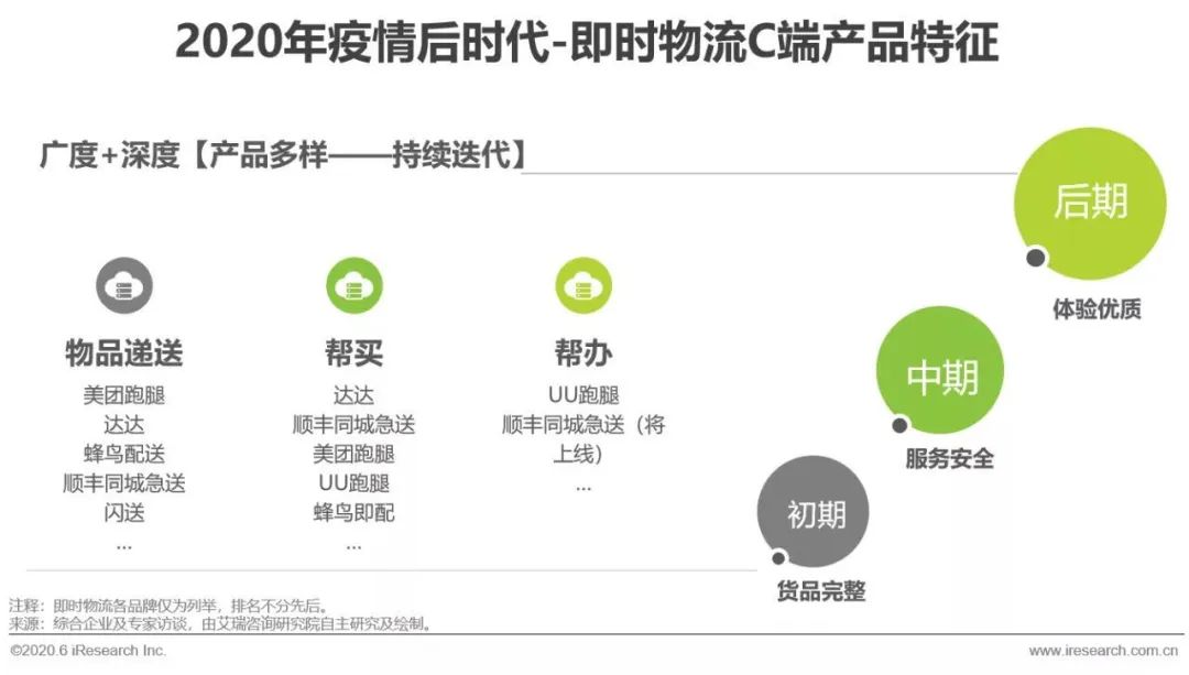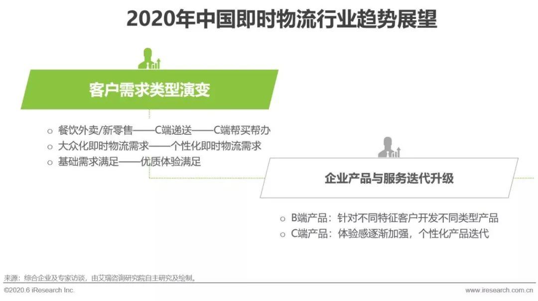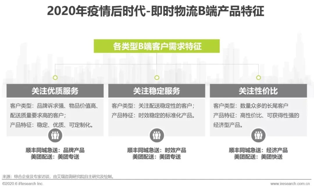受到疫情的影响,疫情后时代B端客户类型的差异化将更加显著,而各家即时物流服务商也将会对应优质服务、稳定服务及性价比的需求,提供不同种类的产品。