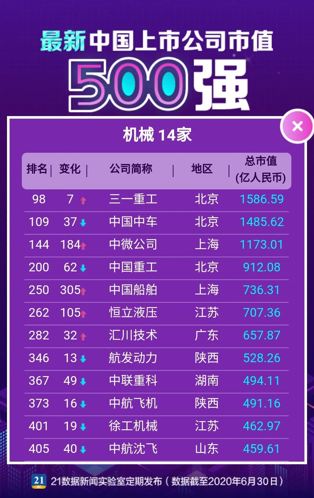 上半年资本市场顺利收官,7月1日晚,知名财经媒体《21世纪经济报道》旗下的21数据新闻实验室公布最新中国市值500强榜单。截至6月30日收盘,三一重工以1587亿元市值列榜单第98位,雄居中国机械行业之首,龙头地位稳固。