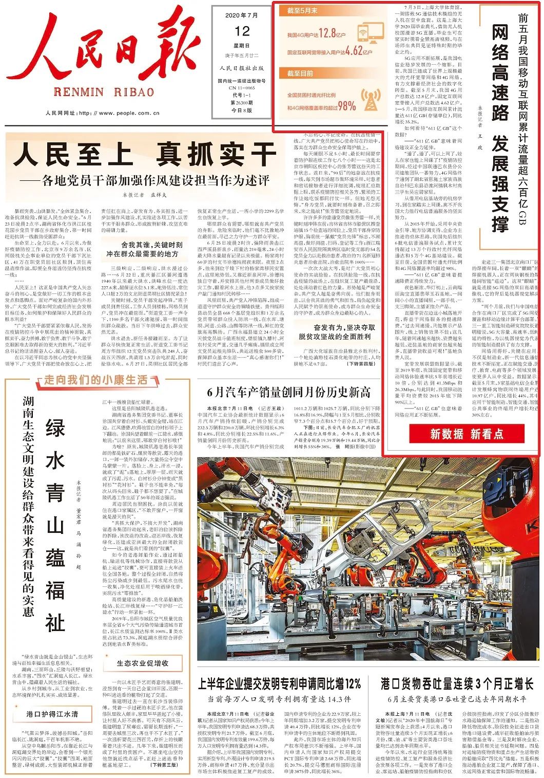7月12日,《人民日报》头版刊文《网络高速路 发展强支撑》聚焦5G通信技术。文章特别为三一在智能制造中的5G应用点赞。