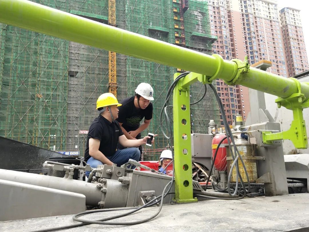 在岳阳某大型搅拌站,服务人员与客户沟通设备使用情况后,没有片刻休息,在烈日炙烤下,立即对客户的泵车进行了探伤检查,并且给出了专业的技术使用指导。客户对中联重科产品质量和优质服务给予了高度认可。