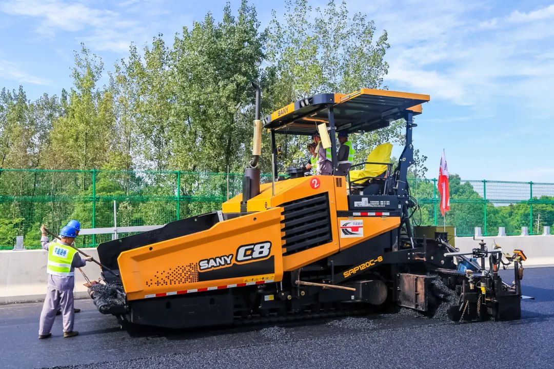 此次承担施工重任的C8摊铺机和压路机,就是三一专为高等级路面大宽度、大厚度摊铺压实作业研制开发的产品。经过权威检测,摊铺机所采用的自主创新的独特熨平板技术完全满足高等级路面施工要求,施工效果得到了权威专家的一致认可。