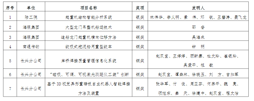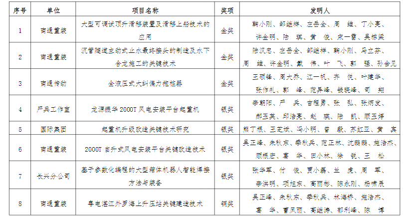 在优秀发明奖中,陆工院《起重机结构智能分析系统》项目获得银奖,海服集团《大型龙门吊整机船运技术》等6个项目获得铜奖;在优秀创新奖中,南通振华重装《大型可调试顶升滑移装置及滑移上船技术的应用》等3个项目获得金奖,严兵工作室《龙源振华2000T风电安装平台起重机》等4个项目获得银奖,南通振华重装《粤电湛江外罗海上升压站关键建造技术》项目获得铜奖。