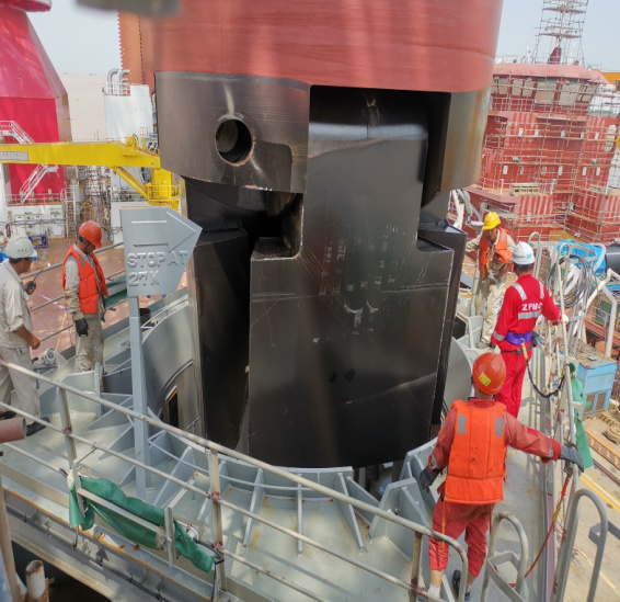功无枉费,力不白出,8月12日10点08分,随着阵阵礼炮声,第四根桩腿成功吊装至指定位置,所有测量数据都符合设计要求。全船4根桩腿吊装仅用4.5天,比原计划提前近5天,极大节省了浮吊、拖轮等费用。海工院项目部部分成员全程协助桩腿吊装,集思广益,为现场及时提供技术支持。