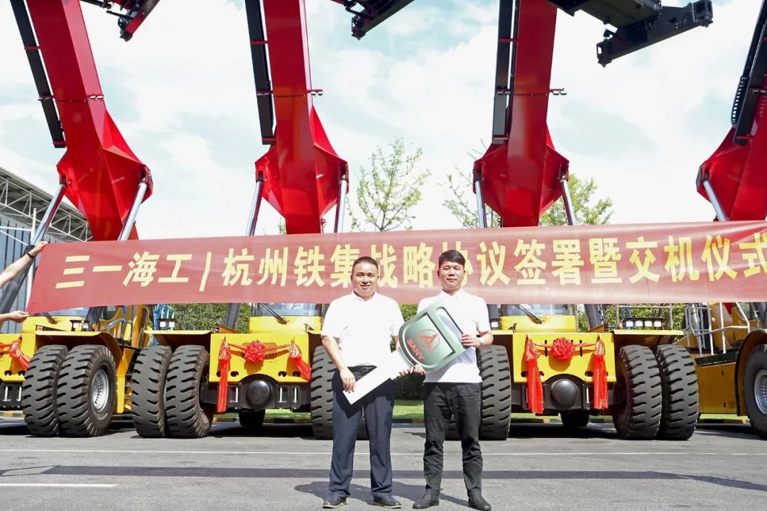 双方签署了一笔总金额超过7000万元的设备采购协议,主要包括SRSC45V型集装箱正面吊和SMHC45型抓钢(料)机两大类产品。值得一提的是,杭州铁集早在2016年就向三一海工采购了一批正面吊产品,在已有33台保有量的基础上,这是第二次向三一海工大批量采购集装箱装卸设备。