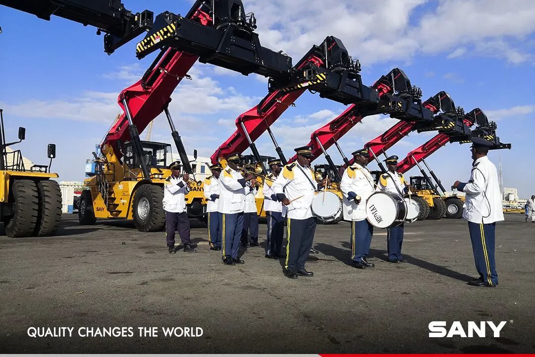 当最后1台正面吊验收完成后,苏丹方面特意安排了警车为10台正面吊开路,在皇家乐队的喧天锣鼓声中,苏丹国旗迎风起舞,“三一红”也成为了码头最亮的风景线。