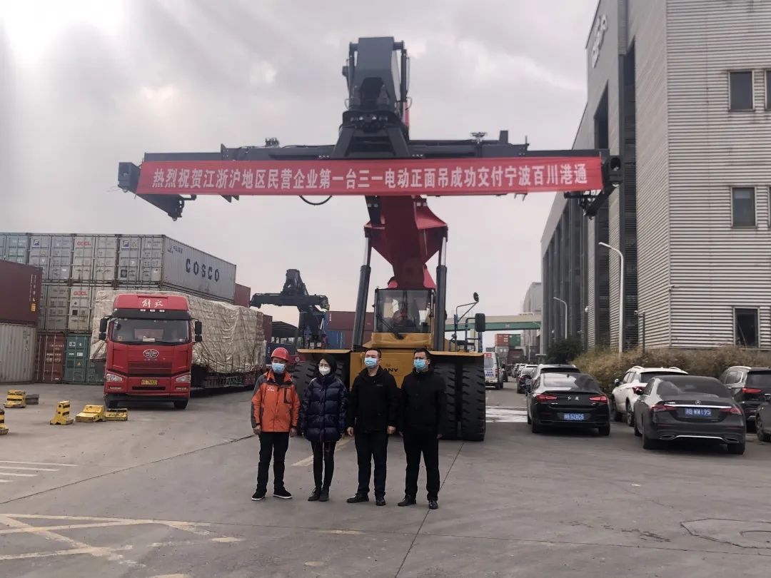 近日,一台三一电动正面吊交付宁波百川港通,这是江浙沪地区民企购买的首台新能源正面吊,也是百川港通第六台三一正面吊。