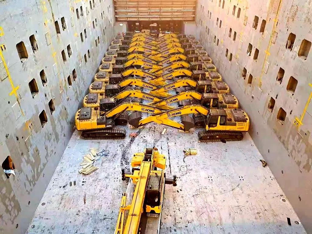 新年新景新气象,大型远洋巨轮上,数百台徐工设备汇聚成金色洪流,整齐排列、蓄势待发,场面蔚为壮观。