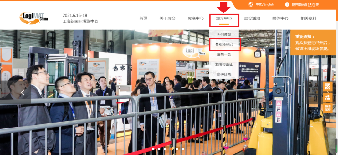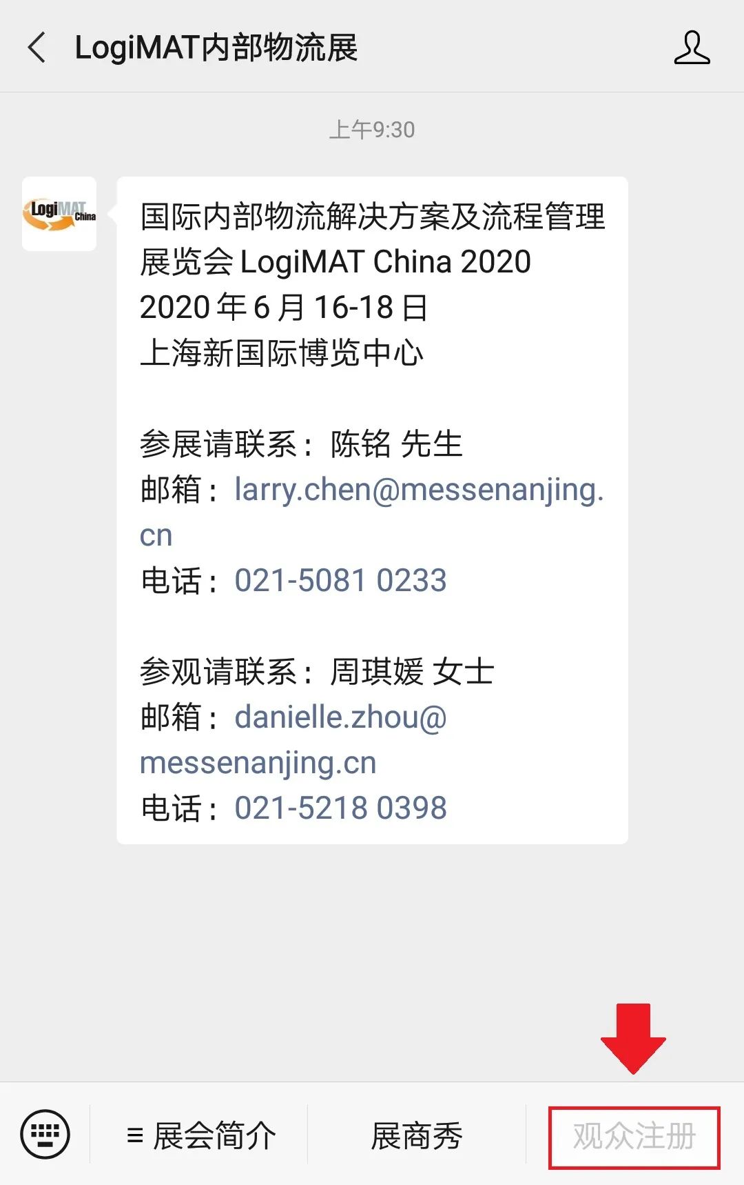 Step 1: 关注公众号“LogiMAT内部物流展”,点击右下方“观众注册。