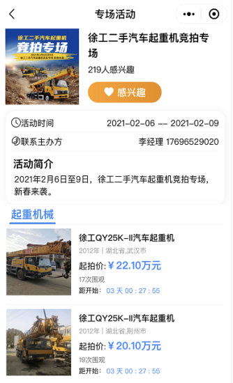 在线拍卖模式,充分竞价,提升交易效率。提供全透明一体化二手工程机械竞拍服务,平台定期组织开展专场线上线下竞拍活动。