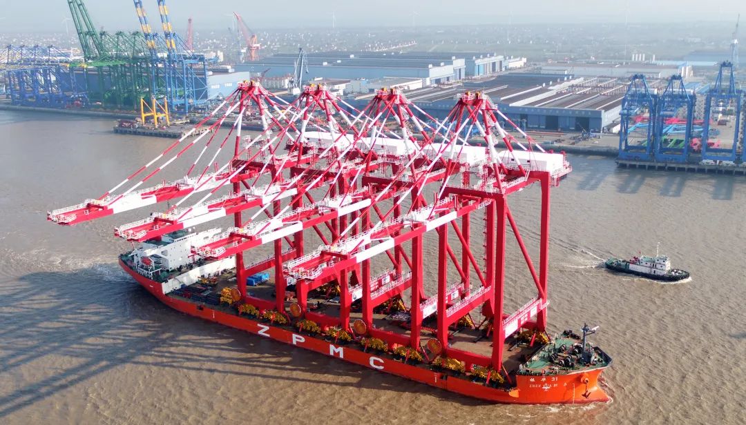 3月15日,装载着4台广州南沙三期岸桥的“振华31”轮从长兴分公司码头起航,前往广州。