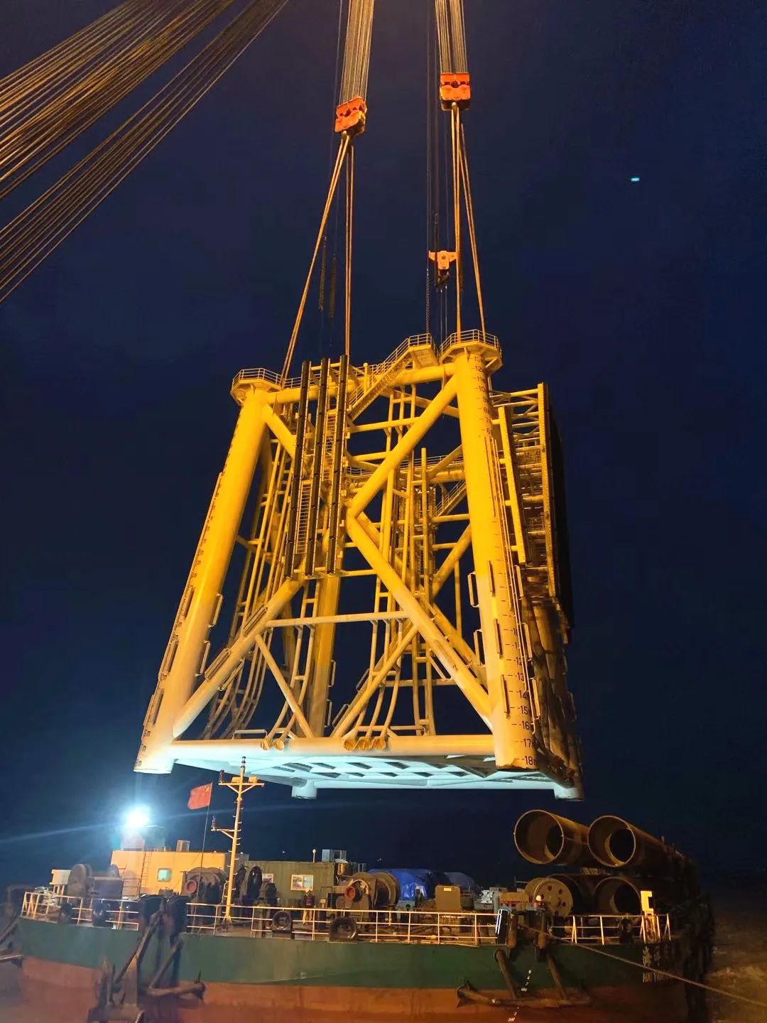 3月18日17:30,“新振浮7”轮从运输船上缓缓吊起重达1350吨的导管架,移船到指定地点后,慢慢下放至海水下插入泥中。待导管架稳稳竖立在海中,“新振浮7”轮开始连续吊起管桩插入导管架,历经29个小时的奋战,顺利完成升压站导管架的安装任务。