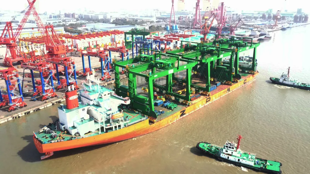 3月27日,“振华32”轮装载中远海运海南洋浦小铲滩码头项目第二批设备缓缓驶离长兴基地码头,前往目的地。