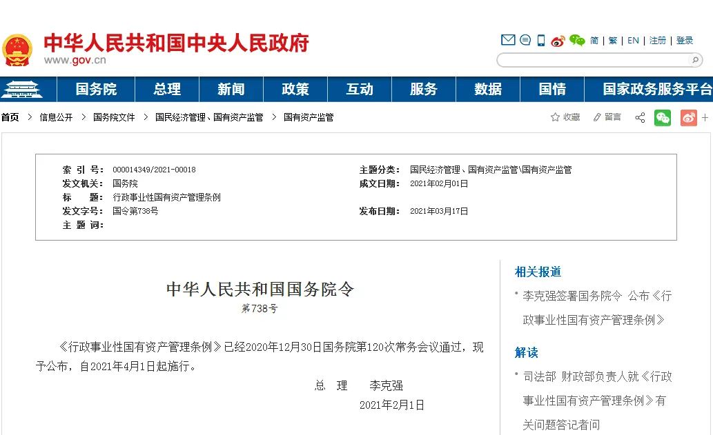 《行政事业性国有资产管理条例》经国务院第120次常务会议通过,现予公布,自2021年4月1日起施行。《条例》明确提出: