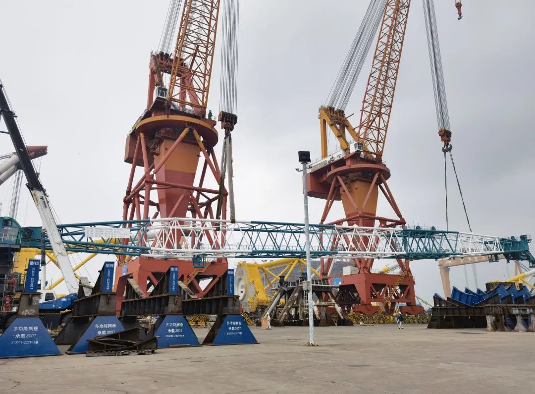 3月27日,经过9小时的持续作业,韩通800吨起重机臂架在两台500吨门机的辅助下顺利完成总装。