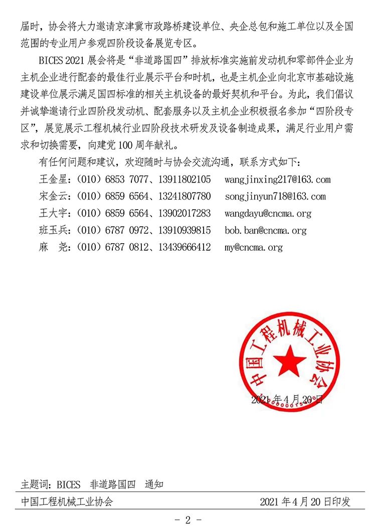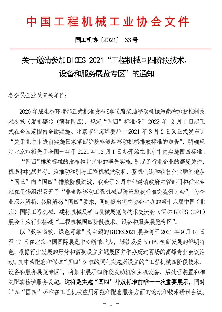 关于邀请参加BICES 2021“工程机械国四阶段技术、设备和服务展览专区”的通知