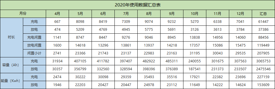 2020年全体电池充电放电容量、能量和时长数据汇总如下