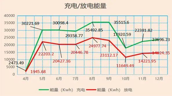 1、全年累计能量(充电227159.45Kwh/放电153608.52Kwh),其各月情况: