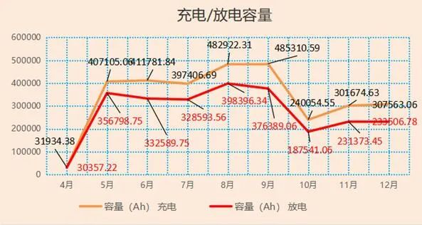 2、全年累计容量(充电3065753Ah/放电2475546Ah),其各月情况: