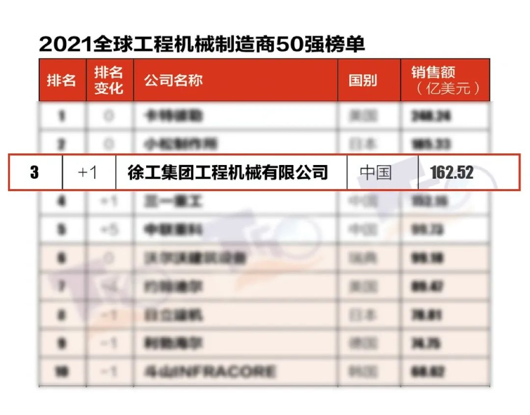 近日,“2021全球工程机械制造商50强”榜单在京发布,徐工进入全球前三甲,这也是中国品牌首度挺进前三。