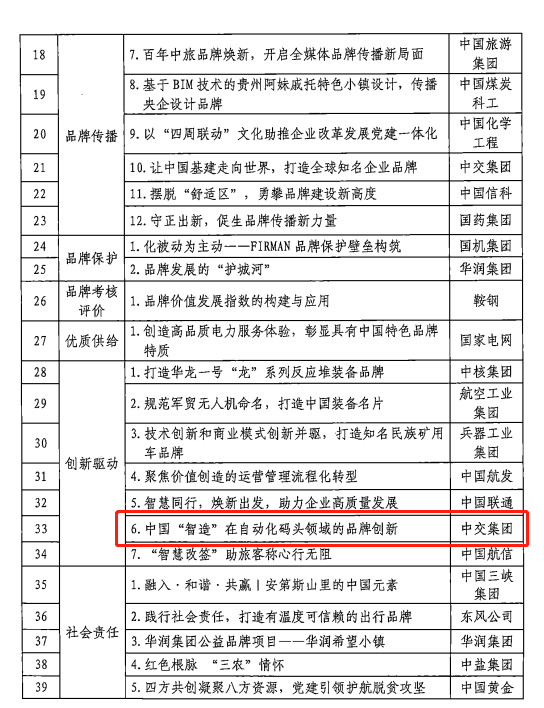 中交集团有两项品牌案例和一项品牌故事入选,其中,振华重工申报的《中国“智造”在自动化码头领域的品牌创新》入选“2020年度100个国有企业品牌建设典型案例”。该案例从创新驱动的角度出发,全面描述了信息技术发展的日新月异、工业互联网大潮汹涌而至的背景下,公司在全球港口机械市场取得突破的生动实践。