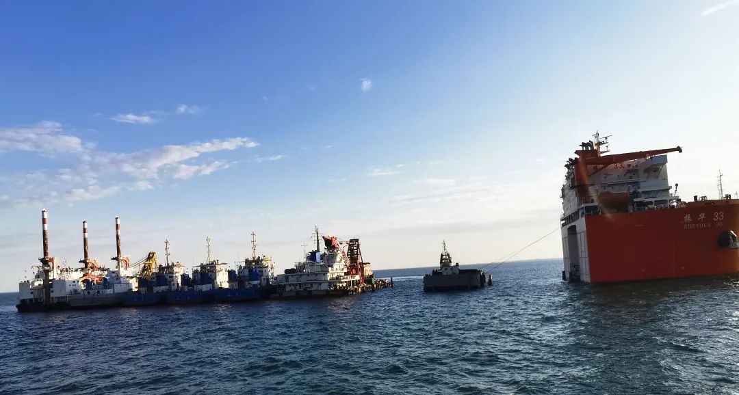 5月11日,“振华33”轮在乌克兰切尔诺莫斯克港成功浮装10艘工程船。