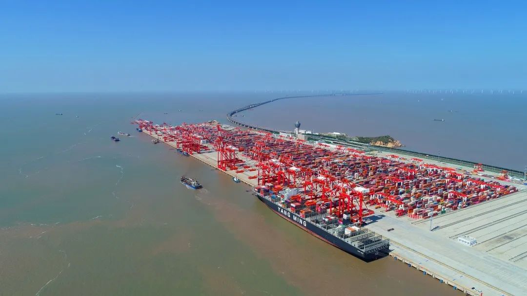 洋山深水港区位于杭州湾口外,由大、小洋山等数十个岛屿组成,是中国首个在海岛建设的港口。自2005年开港至今,洋山一期至四期工程相继建成,互连互通近百条国际航线,日夜不歇地“吞吐”着整个世界。