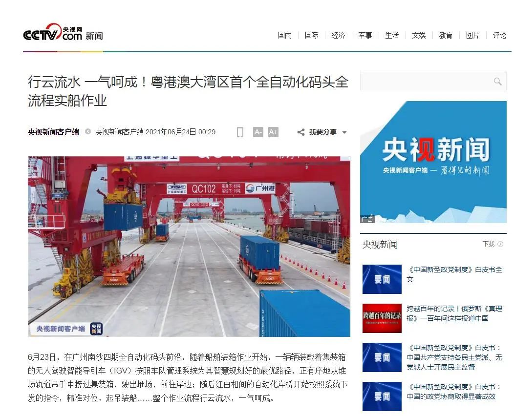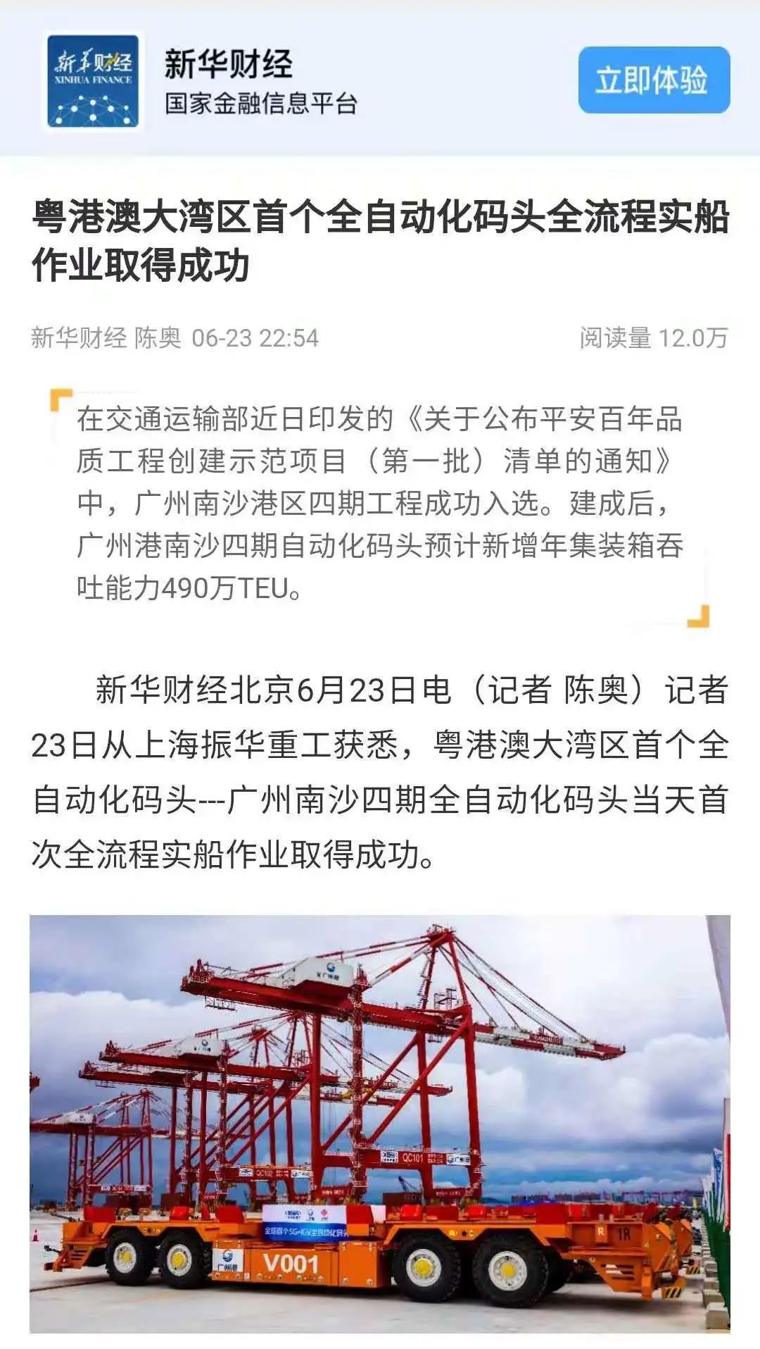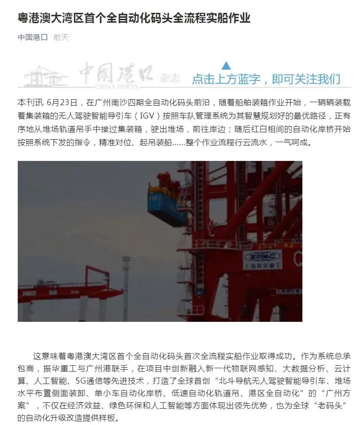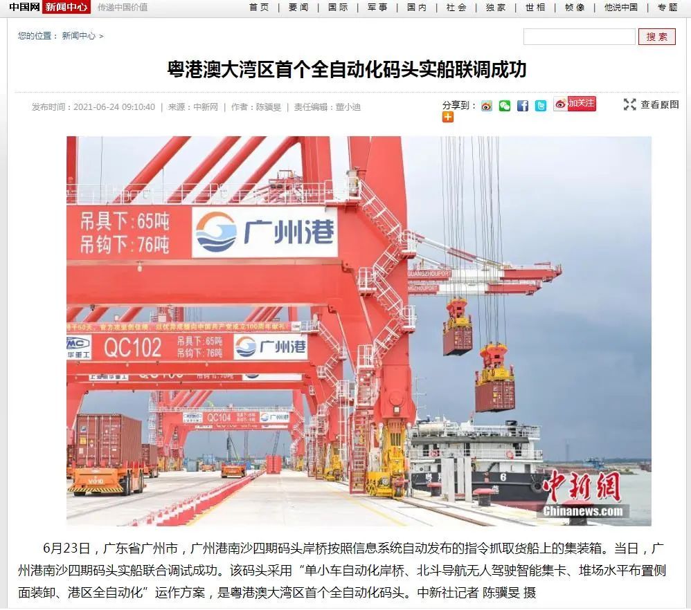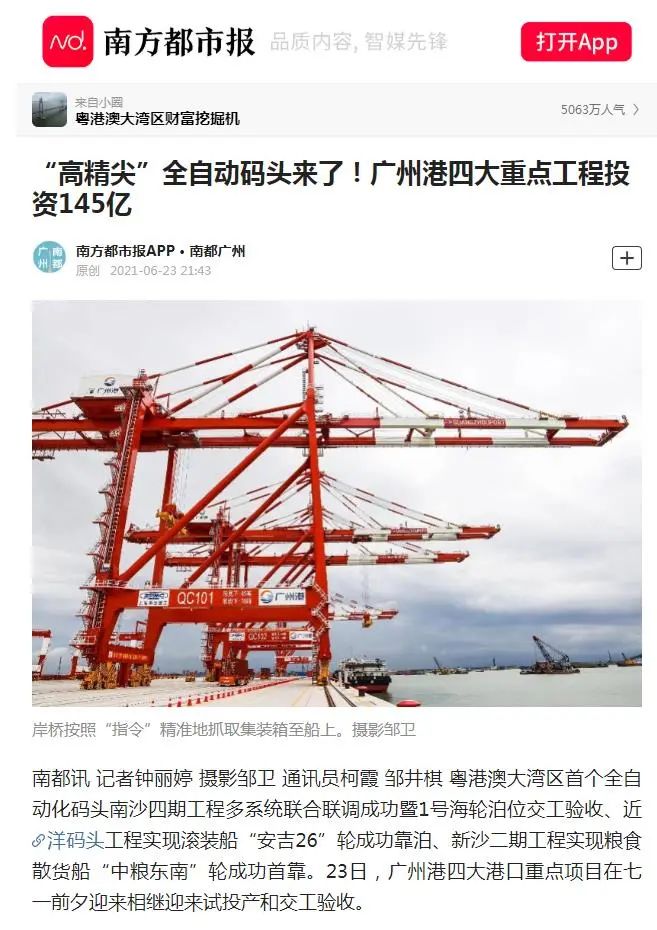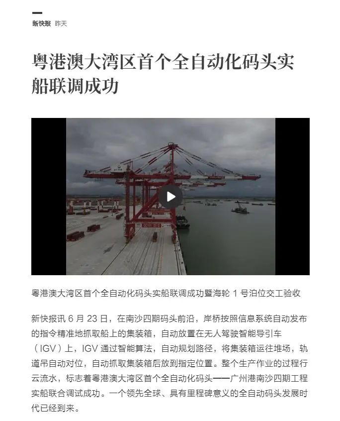 6月23日,广州南沙四期全自动化码头首次全流程实船作业取得成功,该码头也是粤港澳大湾区首个全自动化码头,中央及地方主流媒体纷纷聚焦本次作业并进行报道。
