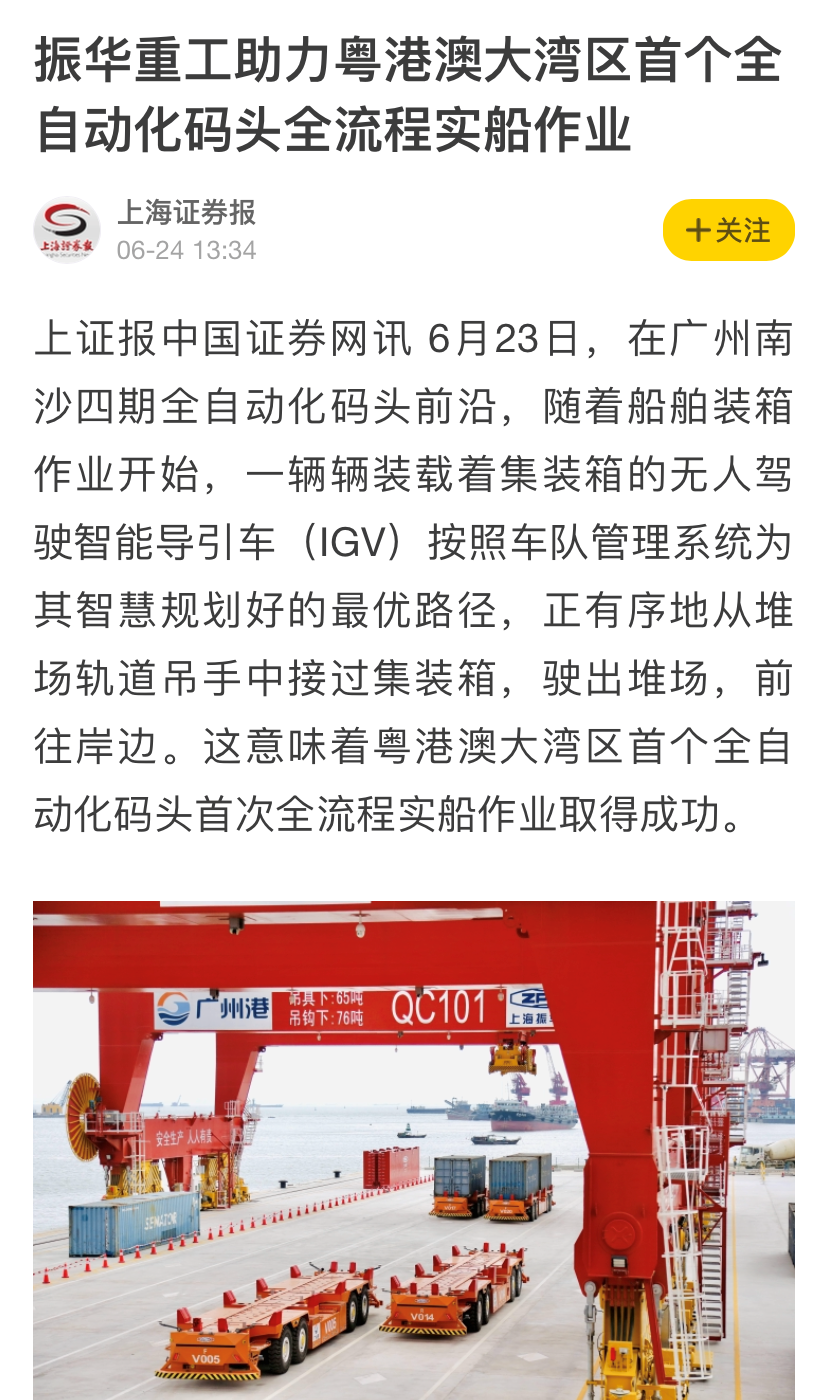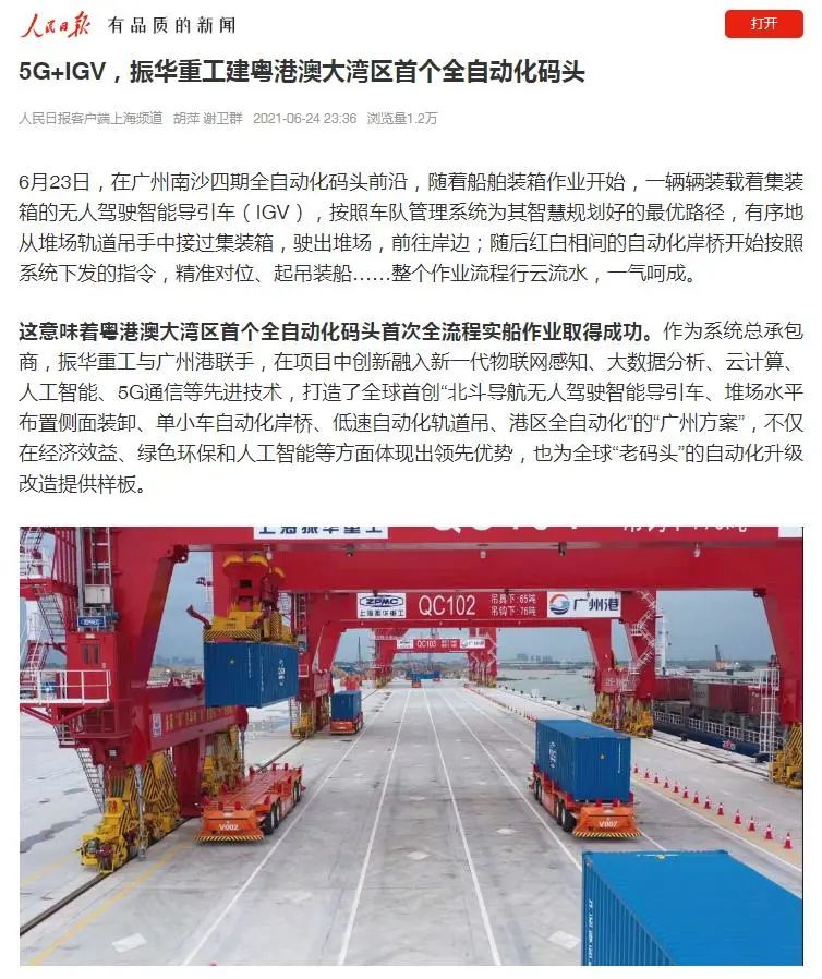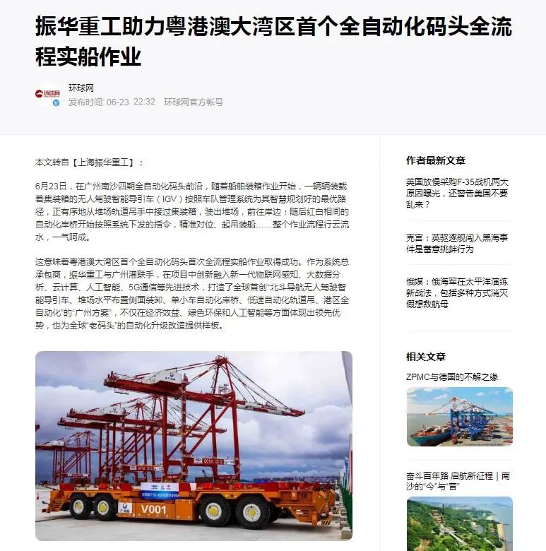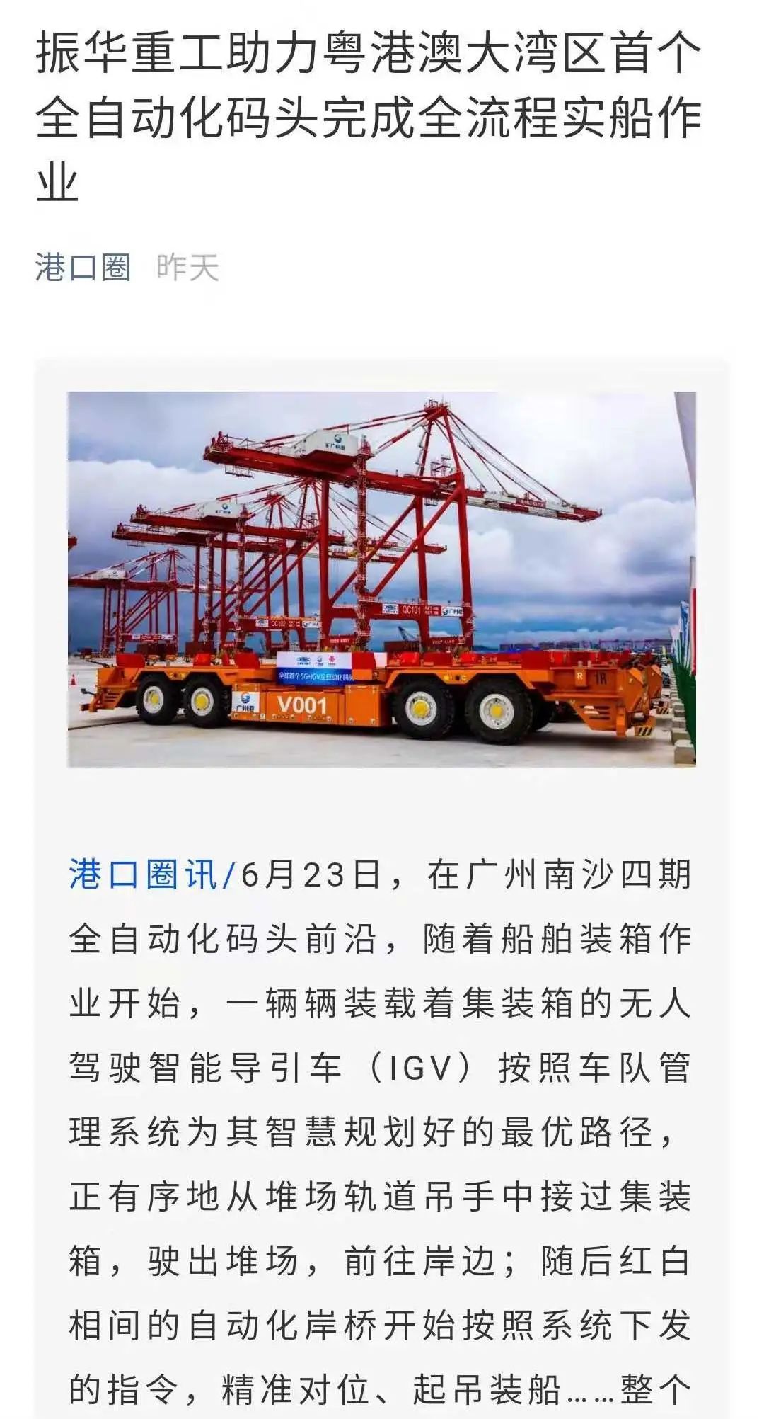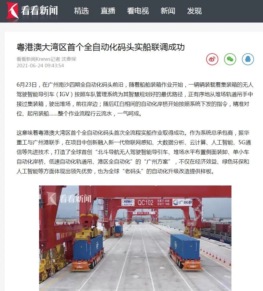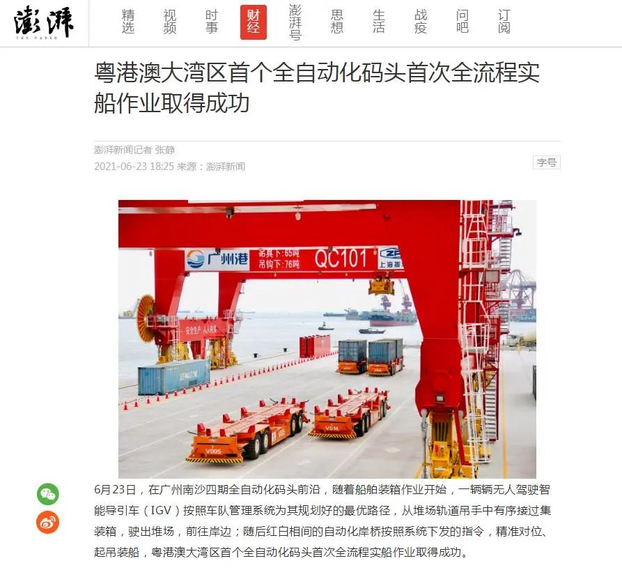 6月23日,广州南沙四期全自动化码头首次全流程实船作业取得成功,该码头也是粤港澳大湾区首个全自动化码头,中央及地方主流媒体纷纷聚焦本次作业并进行报道。