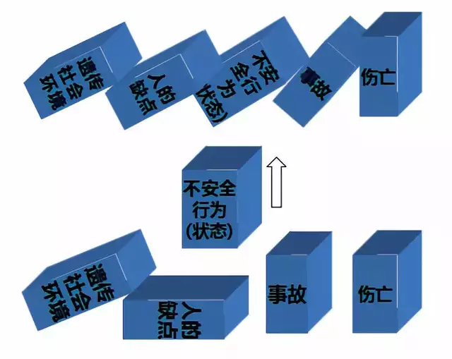 海因里希最初提出的事故因果连锁过程包括如下5个因素:(1)遗传及社会环境遗传因素及环境是造成人的性格上缺点的原因,遗传因素可能造成鲁莽、固执等不良性格;社会环境可能妨碍教育、助长性格上的缺点发展。(2)人的缺点人的缺点是使人产生不安全行为或造成机械、物质不安全状态的原因,它包括鲁莽、固执、过激、神经质、轻率等性格上的先天缺点,以及缺乏安全生产知识和技能等后天缺点。(3)人的不安全行为或物的不安全状态所谓人的不安全行为或物的不安全状态是指那些曾经引起过事故,或可能引起事故的人的行为,或机械、物质的状态,它们是造成事故的直接原因。例如,在起重机的吊荷下停留、不发信号就启动机器、工作时间打闹或拆除安全防护装置等都属于人的不安全行为;没有防护的传动齿轮、裸露的带电体、或照明不良等属于物的不安全状态。(4)事故事故是由于物体、物质、人或放射线的作用或反作用,使人员受到伤害或可能受到伤害的、出乎意料之外的、失去控制的事件。坠落、物体打击等使人员受到伤害的事件是典型的事故。(5)伤害直接由于事故而产生的人身伤害。人们用多米诺骨牌来形象地描述这种事故因果连锁关系,得到多米诺骨牌系列。在多米诺骨牌系列中,一颗骨牌被碰倒了,则将发生连锁反应,其余的几颗骨牌相继被碰倒。如果移去连锁中的一颗骨牌,则连锁被破坏,事故过程被中止。海因里希认为,企业安全工作的中心就是防止人的不安全行为,消除机械的或物质的不安全状态,中断事故连锁的进程而避免事故的发生。
