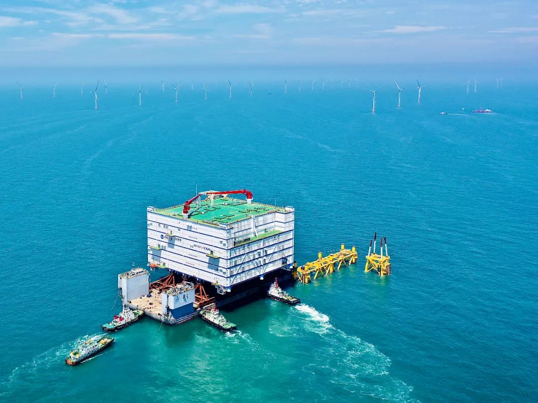 7月18日22时18分,历经17个小时的海上安装作业,重达2.2万吨的海上换流站上部模块与下部导管架成功对接,标志着振华重工承建、三峡集团和中广核投资的世界最大、亚洲首座海上换流站——如东海上换流站正式完成海上安装,扎根深海。
