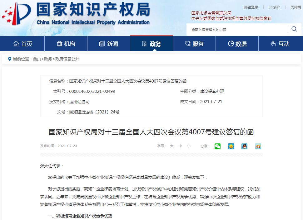 近日,国家知识产权局对这件十三届全国人大四次会议第4007号建议予以公开回复。回复中称,基于企业创新发展需求,积极培育企业知识产权竞争优势;积极推进快速协同保护机制建设,着力提升中小企业知识产权保护能力;推动完善知识产权价值评估体系。下一步,将持续深化优势示范企业培育工作,充分发挥优势示范企业带动引领作用;持续推进知识产权快速协同保护工作,与地方共同建设知识产权保护中心和快速维权中心;加快推动专利评估指引国家标准制定,进一步完善知识产权运营平台体系,畅通知识产权交易运营渠道等。