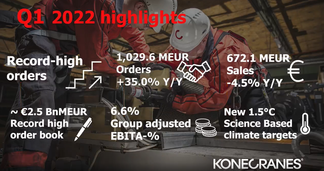 4月27日,科尼公司(Konecranes)发布了2022 年 1 月至 3 月中期报告,其中亮点是以可比货币计算,科尼第一季度收到的订单同比增长 32.4%,超过 10 亿欧元,在充满挑战的市场环境下,订单量创历史新高。