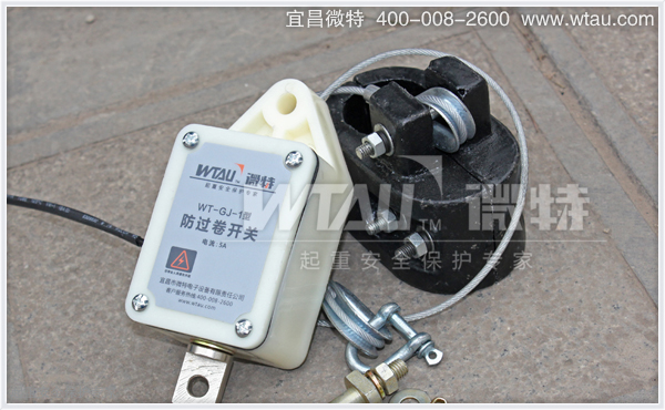 GJ型防过卷开关(钩头限位开关),是用于起重机械钢丝绳防过卷限位的一种电器自动保护开关。它与一适当重量的重锤配套,利用吊钩的上下运动托起或放下重锤时断开或导通开关,实现自动切断卷扬机动力电源连通刹车系统,达到限制钢丝绳过卷的目的,以及达到吊钩在一定高度内升降的目的。